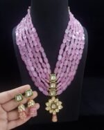 Feel beautiful with this soft pink bead necklace. It features a large gold-toned pendant and matching drop earrings, making it perfect for weddings, parties, and festive celebrations.