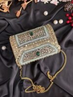 Shop this elegant designer clutch with stones, beads & pearls. A luxurious wedding clutch with chain sling, perfect for bridal, party & festive looks.
