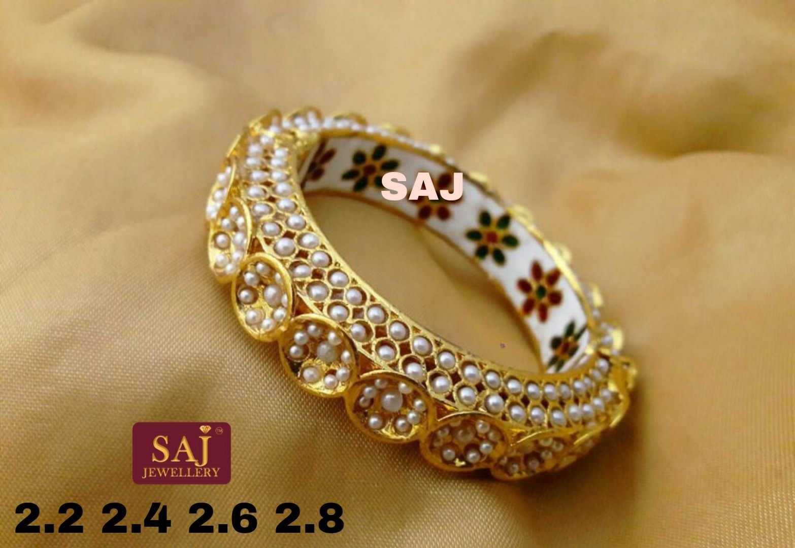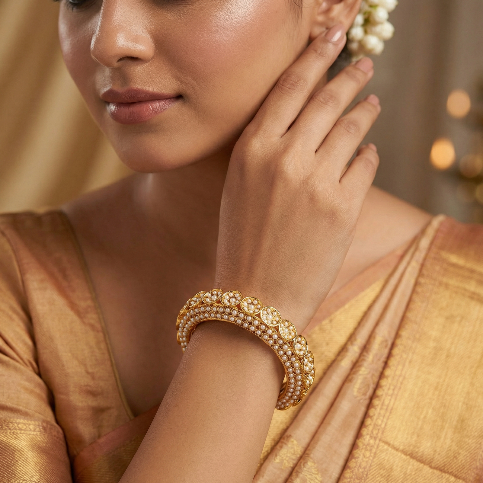 Shop this stunning pearl-studded gold bracelet, perfect for weddings, festive wear, and special occasions. Premium quality ethnic jewelry designed to elevate your traditional look.