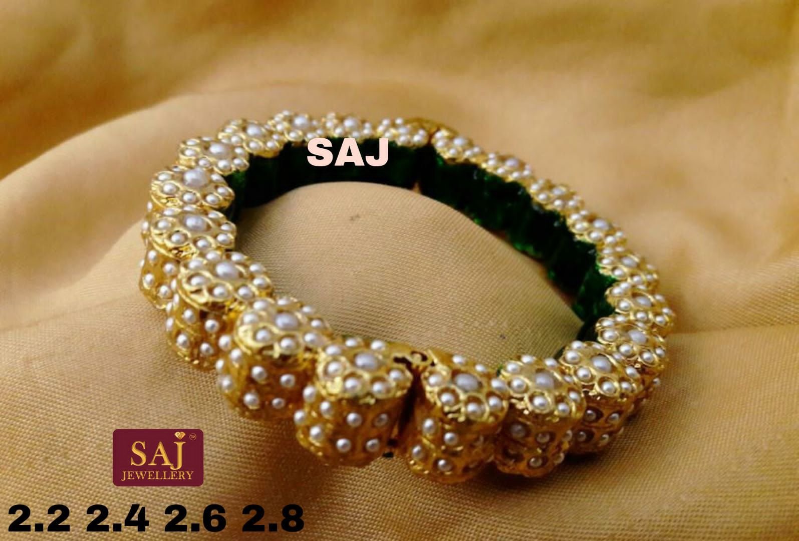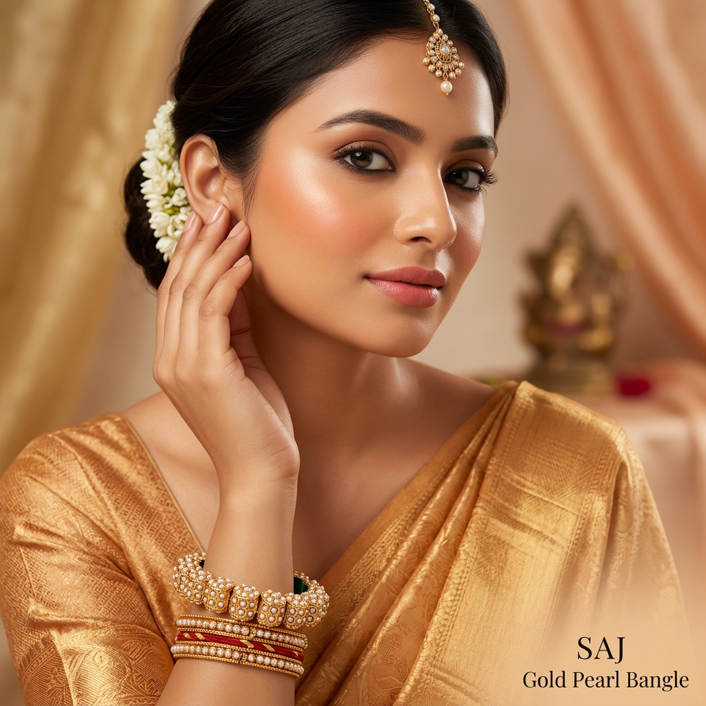 Enhance your bridal and festive look with this exquisite gold pearl bangle set, crafted with intricate detailing and timeless elegance. Perfect for weddings, celebrations, and traditional occasions. Shop now at SAJ Jewellery.