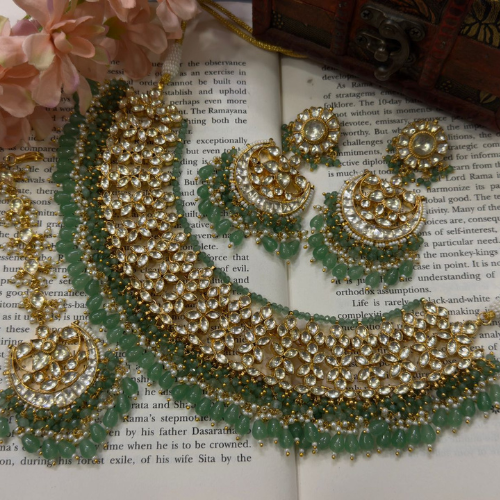 Grace your festive and bridal look with this stunning Kundan necklace set adorned with green beads, intricate stone craftsmanship, and matching chandbali earrings with maang tikka. Perfect for weddings, mehendi, and traditional occasions.