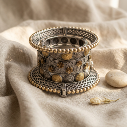 Shop this elegant handcrafted silver kada bracelet adorned with intricate floral engravings and gold-toned rose motifs. Perfect for weddings, festive occasions, and everyday ethnic wear.