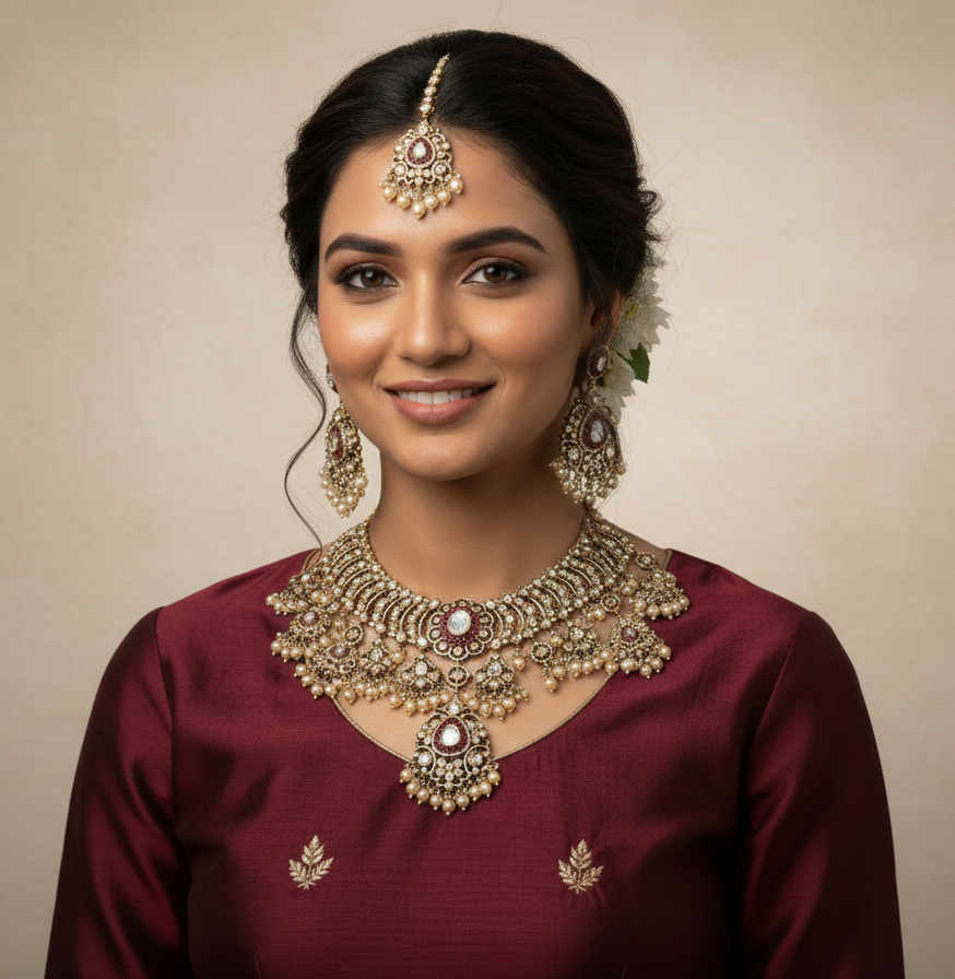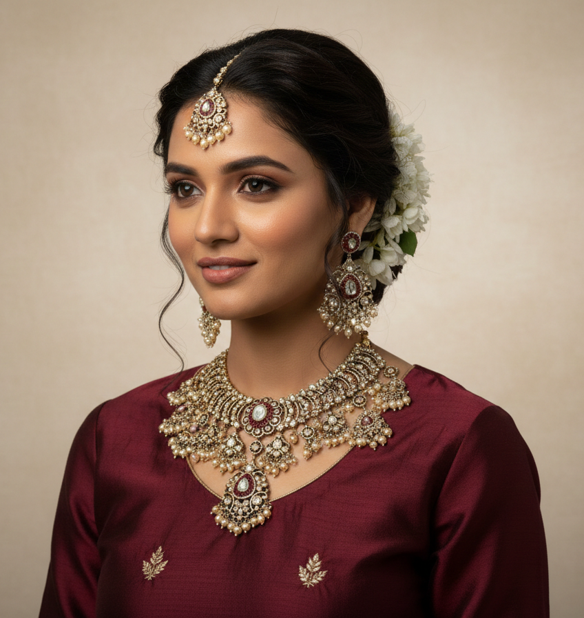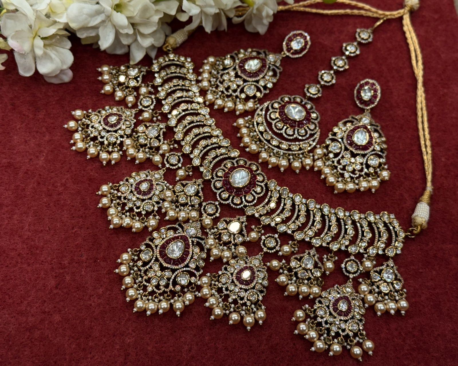 Elegant maroon kundan bridal necklace set with pearl detailing and matching earrings. A timeless antique-style design, perfect for weddings, receptions & traditional occasions.