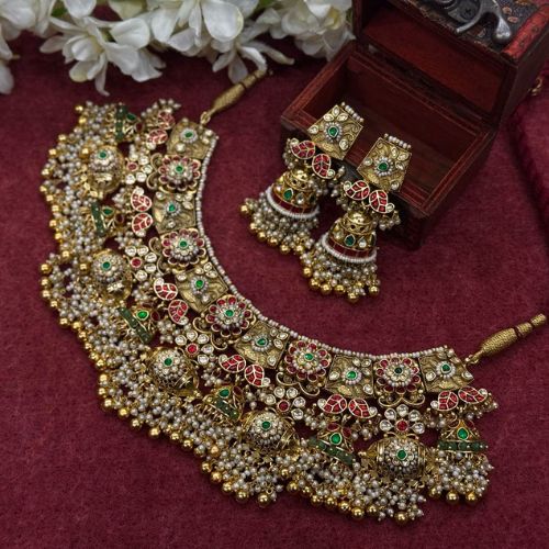 Traditional multicolor temple kundan necklace set with pearl and gold bead detailing, paired with matching jhumka earrings. Perfect for bridal wear, weddings & festive occasions.